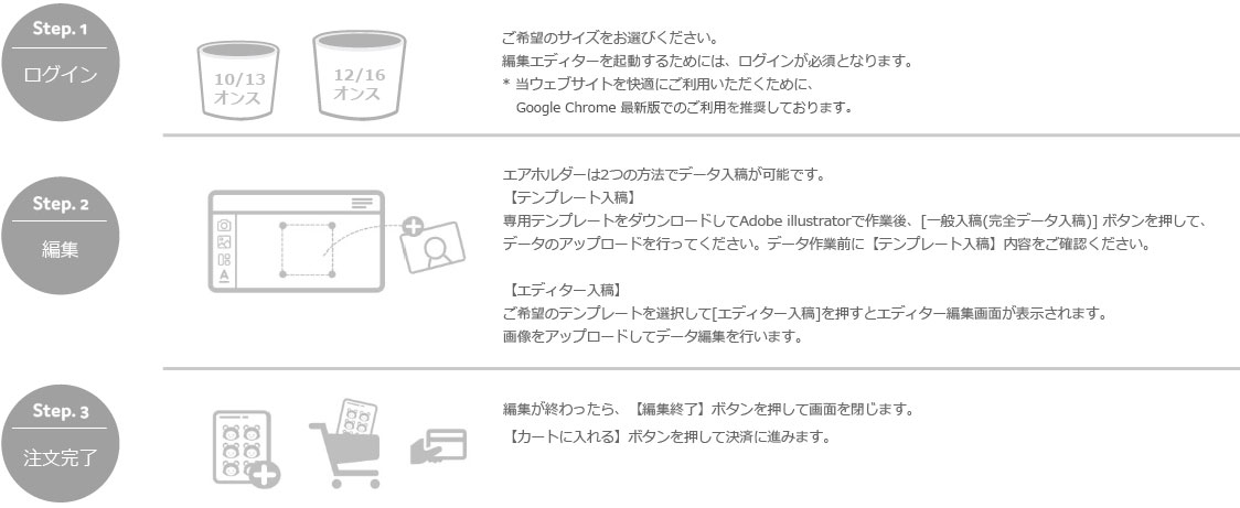 テンプレートを選択した後、お好きな写真をアップロードすると、別途デザイン作業なしで簡単にエアホルダーの注文が可能です。