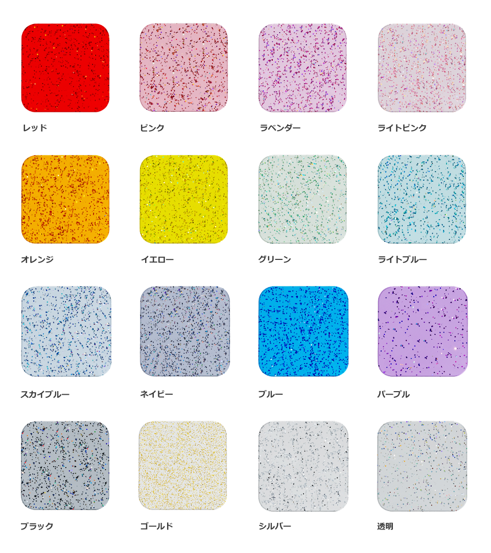 - グリッターアクリルは、小さなラメやパールのような輝く素材を混ぜたアクリルです。16種類のカラーからお選びいただけます。