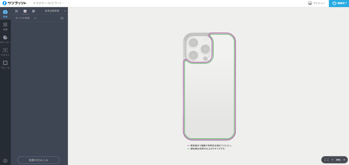 - ・デザインは必ず緑色線の内側に配置してください。緑色線より外側に配置しても印刷されませんのでご注意ください。