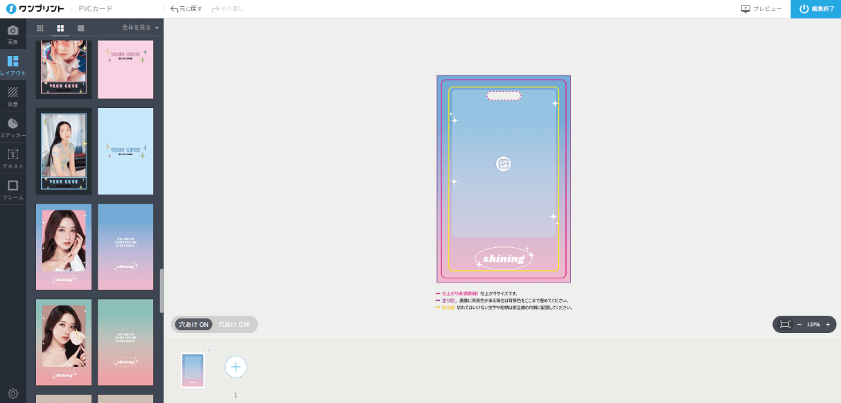 - ※編集エディタ―画面で穴あけを選択しても(穴あけON)、注文ページの後加工で穴あけを選択していない場合、注文内容に反映されません。