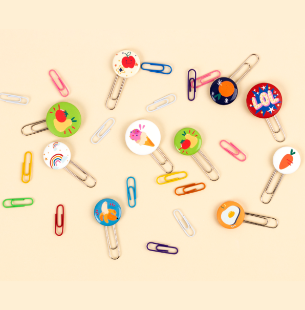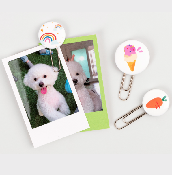 - 缶バッジとゼムクリップはくっついた状態で配送されます。