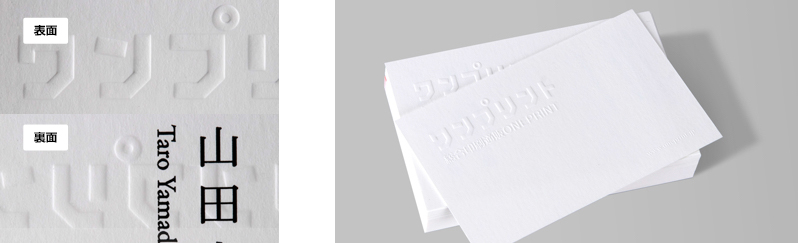 - 型押し(エンボス)は、型を当て圧を加えることにより目立たせたい部分を浮き上がらせる加工のことで、 立体感が出てシンプルかつ洗練された印象に仕上がります。