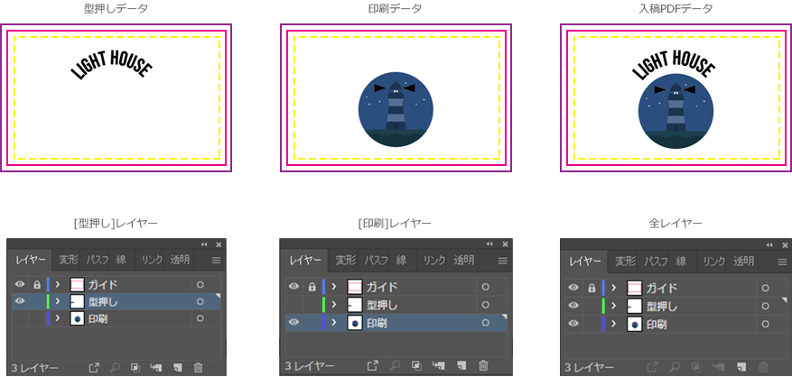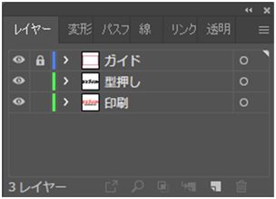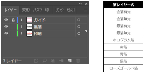 - 基本的に後加工データのレイヤー名は各後加工の名称通りにしていただき、([印刷]レイヤーとレイヤー区分)