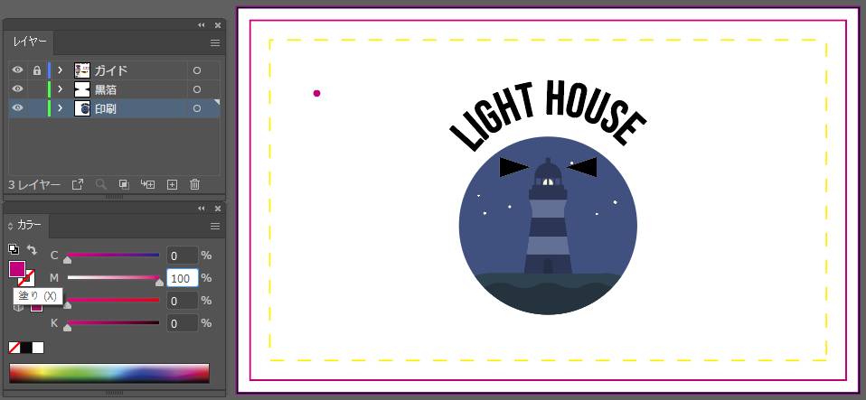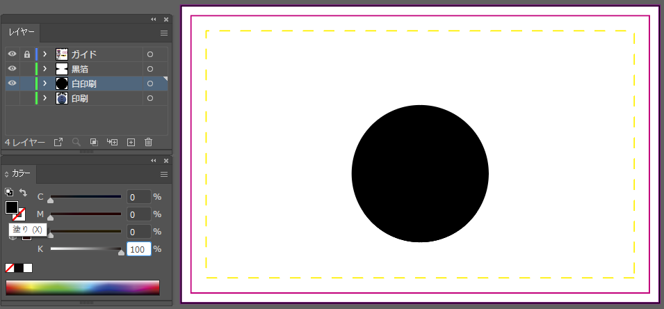- (2) [白印刷]レイヤーに貼り付けたオブジェクトをK:100%(スミベタ)で塗りつぶしてください。(塗り:オン、線:オフ)