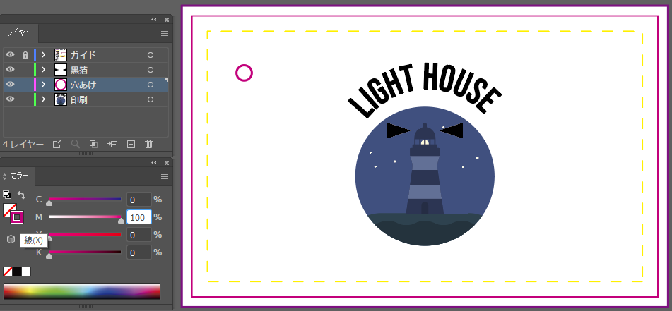 - A [印刷]レイヤー内に「M:100%」の塗りつぶしで、穴をあけたい位置に1mmの点(穴の中心を示す点)を入れる方法