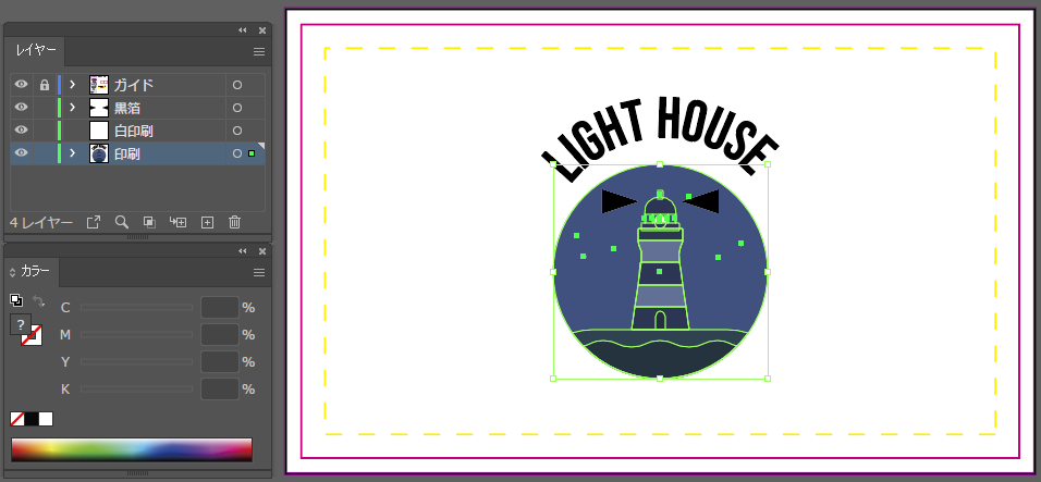 - → [印刷]レイヤーを一旦非表示にし、貼り付けたオブジェクトをK:100%で塗りつぶします。