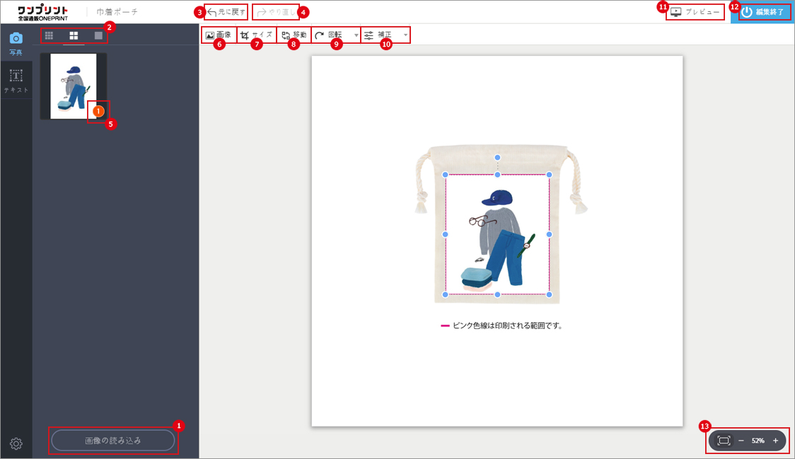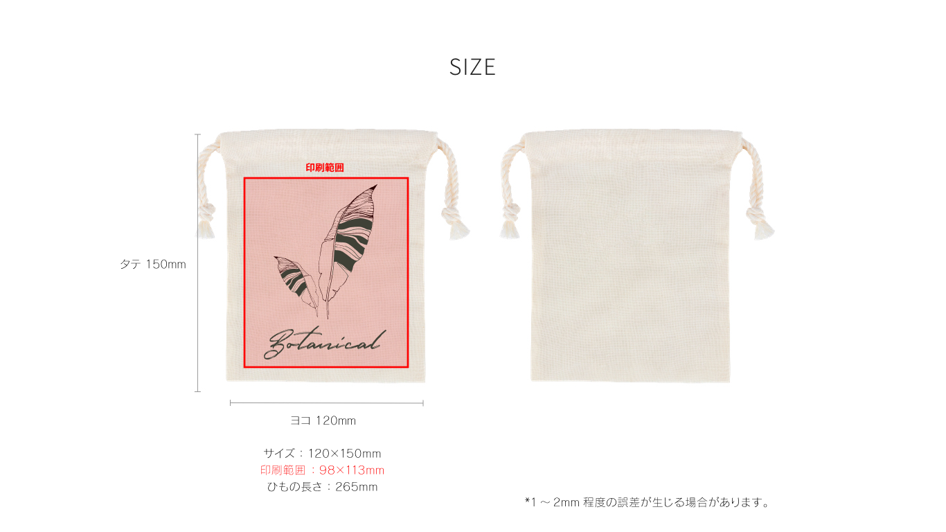 サイズ 印刷範囲 横 縦 紐 120x150 98x113 120 150 265 - *商品サイズは、測定方法に応じて、1-2mm程度の誤差が生じる場合があります。