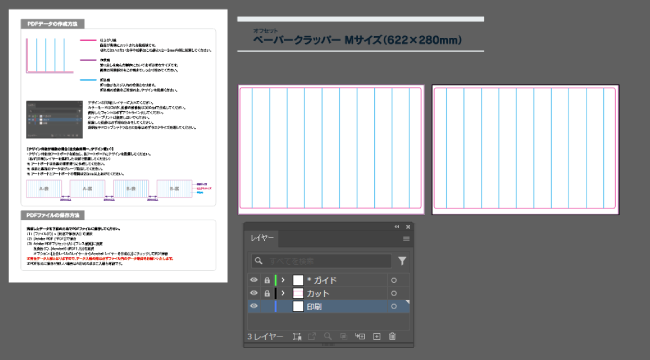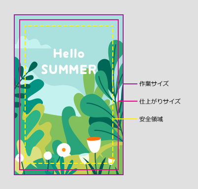 - ○ ピンク線 (仕上がり線):商品が実際にカットされる裁断線です。切れてはいけない文字や絵柄はこの線より2~3mm内側に配置してください。