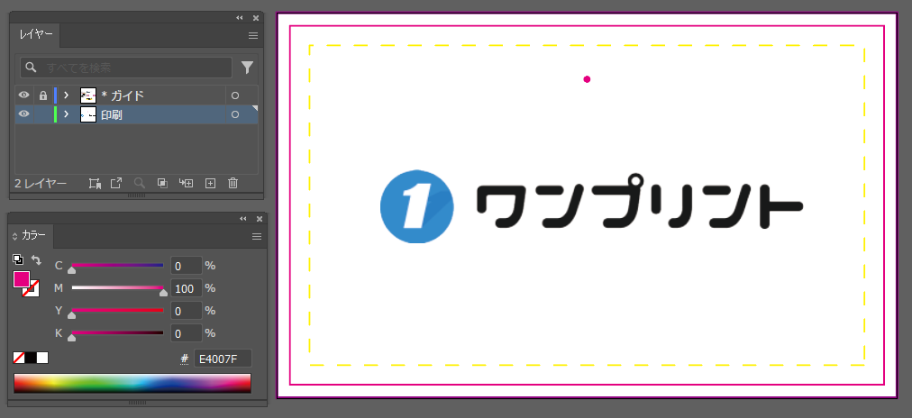 - A [印刷]レイヤー内に「M:100%」の塗りつぶしで、穴をあけたい位置に1mmの点(穴の中心を示す点)を入れる方法
