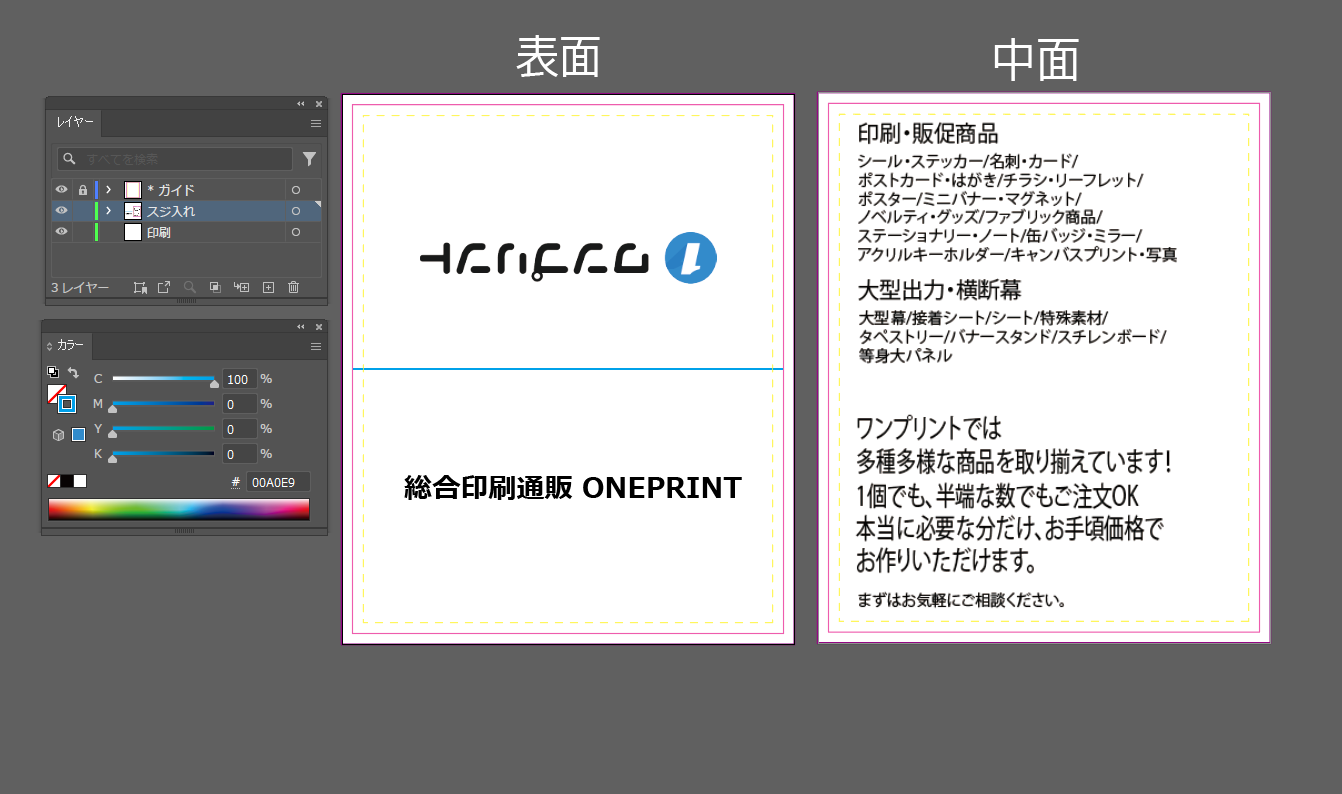 - (例:2つ折りの場合、表面のスジ入れ線を基準に向かって左側に”裏表紙”、右側に”表表紙”になるデザインを配置してください。)