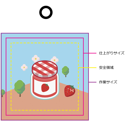 - 〇 黄色線(安全領域):裁断ズレによるデザイン欠けを防ぐため内側に余裕をもった範囲です。