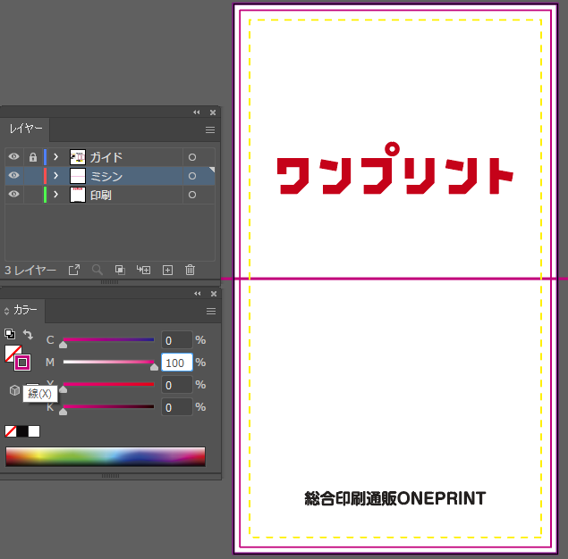 - [ミシン]レイヤー内に「M:100%」の線で、ミシン目(切り取り線)を入れたい位置をご指定ください。