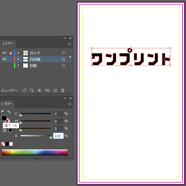 - (3) [白印刷]レイヤーに貼り付けたオブジェクトをK:100%(スミベタ)で塗りつぶしてください。(塗り:オン、線:オフ)