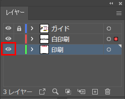- (6) 白印刷用データの作成が終わったら、[印刷]レイヤーに目のマークをつけて表示するようにしておきましょう。(※この作業を忘れないようご注意!)