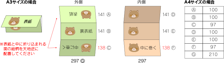 - 表面の表紙になる面と中に折り込まれる面の絵柄を天地逆に配置する必要があります。