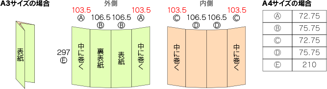 - ※ 「巻き三つ折り」「観音折り」「開き観音折り」をご選択の場合は、下記の注意事項を必ずご確認のうえ、データを作成してください。